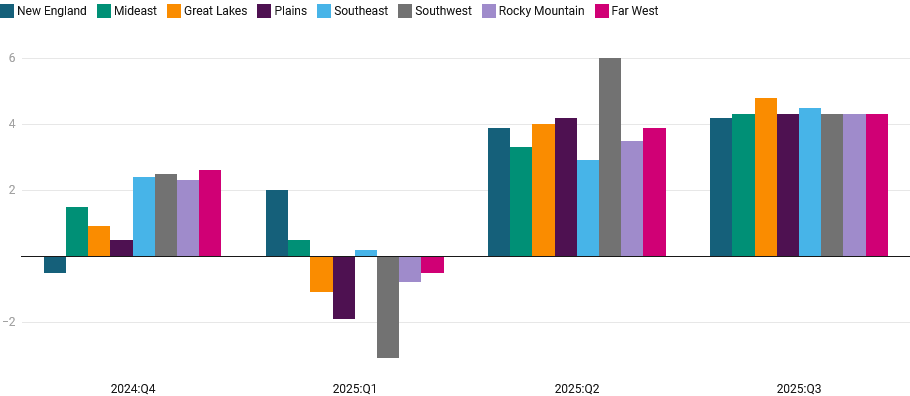 Regionally, real GDP increased in all eight regions between the second and the third quarters of 2025. Growth was widespread, with regional gains ranging from a 4.2 percent increase in the New England region to a 4.8 percent increase in the Great Lakes region, underscoring broad economic strength across the country.