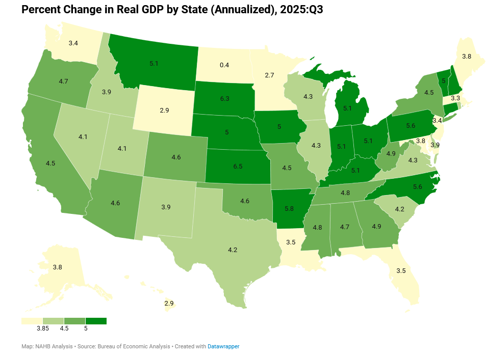 In the third quarter of 2025, the Bureau of Economic Analysis (BEA) reported that real gross domestic product (GDP) expanded nationally, with growth recorded across all states and the District of Columbia. The increase in GDP reflected broad-based economic momentum, supported by contributions from several major industries. At the state level, real GDP growth ranged from a 6.5 percent increase in Kansas to a 0.4 percent increase in North Dakota.