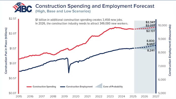 “If current consensus forecasts hold true, the construction industry will need to bring in 349,000 new workers in 2026 just to keep the supply and demand for labor in equilibrium,” said ABC Chief Economist Anirban Basu. “Failing to do so will worsen labor shortages, especially in certain occupations and regions, placing further upward pressure on labor costs.