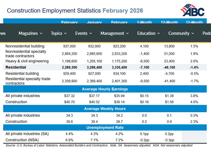 “Construction employment shrank again in February and has now declined in 8 of the past 11 months,” said ABC Chief Economist Anirban Basu. “Both the residential and nonresidential segments lost jobs for the month, adding to a recent string of downbeat industry data releases; construction spending has been in decline for several quarters, and ABC’s Construction Backlog Indicator fell to a four-year low in January. With the conflict in Iran adding to trade policy-related uncertainty and crude oil prices well above $80 per barrel, the industry’s outlook remains downbeat through the first few months of 2026.”