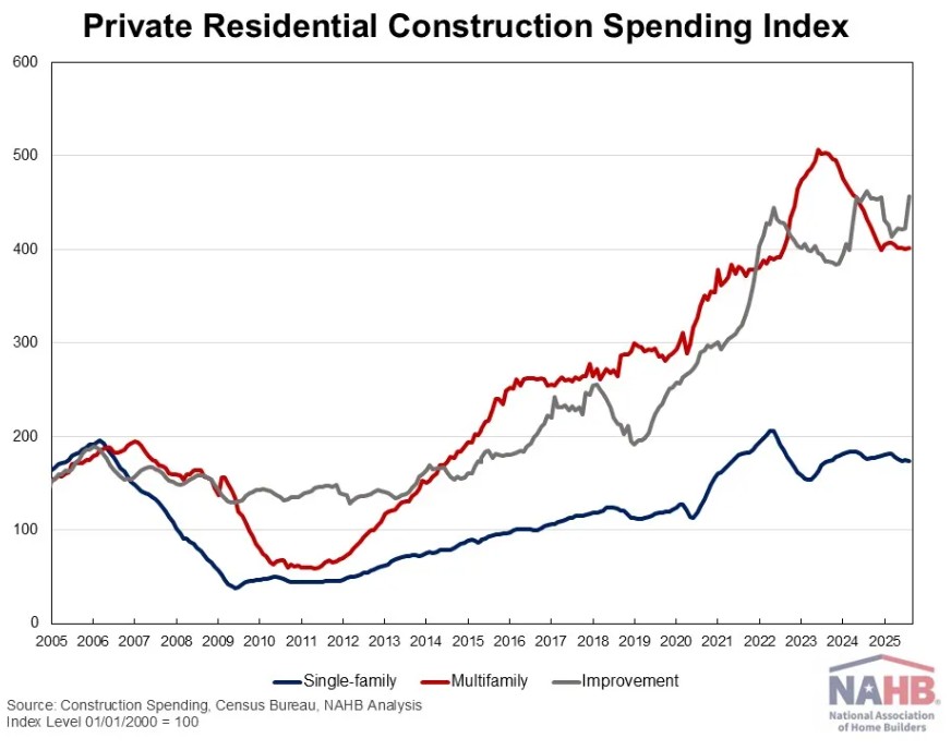 According to the latest U.S. Census construction spending data, single-family construction spending slipped 0.4% in August, in line with the soft builder sentiment reflected in the August NAHB/Wells Fargo Housing Market Index (HMI). Compared to a year ago, single-family construction spending decreased by 1.1%. Improvement spending (remodeling) posted a solid 8.2% gain for the month, but it remained 1.3% lower than in August 2024. The remodeling sector continues to show resilience, supported by strong homeowner equity and persistent demand for home improvements. Meanwhile, multifamily construction spending rose 0.2% in August, marking a pause in the downward trend that began in mid-2023. Compared to a year earlier, multifamily spending was down 7.1%.