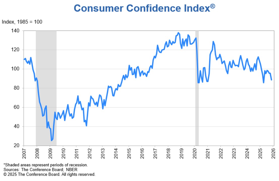 The Conference Board Consumer Confidence Index declined by 6.8 points in November to 88.7 (1985=100) from 95.5 in October. The Present Situation Index—based on consumers’ assessment of current business and labor market conditions—fell by 4.3 points to 126.9. The Expectations Index—based on consumers’ short-term outlook for income, business, and labor market conditions—fell by 8.6 points to 63.2. The Expectations Index has tracked below 80 for 10 consecutive months, the threshold under which the gauge signals recession ahead. The cutoff for preliminary results was November 18, 2025.