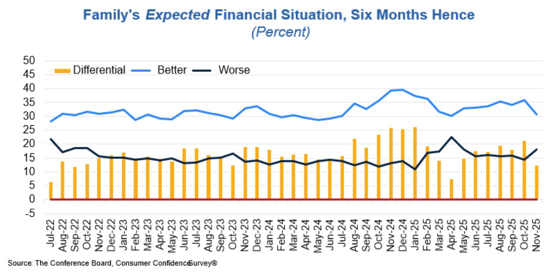 "The labor market differential—the share of consumers who say jobs are “plentiful” minus the share saying 'hard to get'—dipped again in November after a brief respite in October from its year-to-date decline. All three components of the Expectations Index deteriorated in November. Consumers were notably more pessimistic about business conditions six months from now. Mid-2026 expectations for labor market conditions remained decidedly negative, and expectations for increased household incomes shrunk dramatically, after six months of strongly positive readings.”