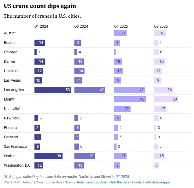 “The balance between declining and rising crane counts points to a transitional phase, where developers are weighing opportunities against ongoing financial pressures,” wrote Taryn Harbert, RLB associate principal, in the report.