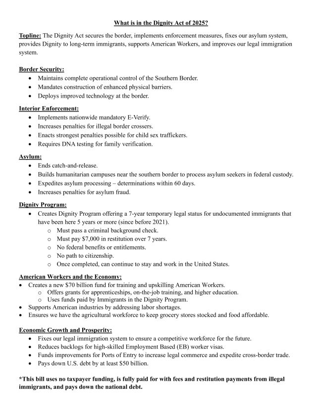 A central feature of the Dignity Act is the creation of a structured legal mechanism, commonly referred to as “Dignity Status,” to address individuals currently living and working in the U.S. without legal authorization. Technically, this is not an amnesty or a direct pathway to citizenship. Instead, it is a conditional, time-bound legal status (typically structured as a multi-year renewable program) that requires applicants to pass background checks, register with federal authorities, and maintain continuous employment.