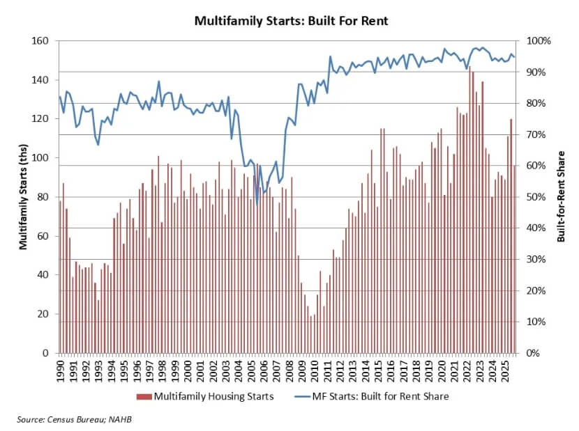 According to NAHB analysis of quarterly Census data, the count of multifamily, for-rent housing starts increased year-over-year during the fourth quarter of 2025. For the quarter, 96,000 multifamily residences started construction. Of this total, 91,000 were built-for-rent. This built-for-rent total was 18% higher than in the fourth quarter of 2024. This marks a significant increase, and it is possible these numbers will be revised lower in future Census data given other multifamily data reporting.