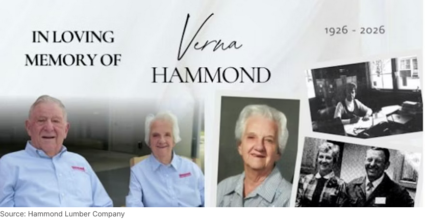 Hammond Lumber announced that company co-founder Verna Hammond died in early January. The Maine-based company shared the news via social media: