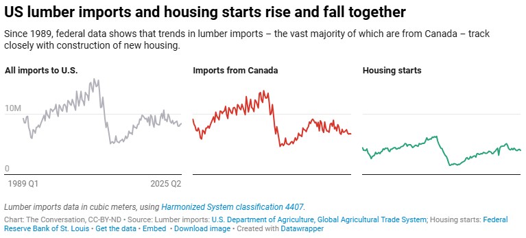 Lumber, especially softwood lumber like pine and spruce, is critical to U.S. home construction. Its availability and price directly affect housing costs and broader economic activity in the building sector. The U.S. imports about 40% of the softwood lumber the nation uses each year, more than 80% of that from Canada.