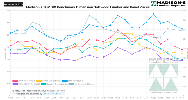 The Madison’s Lumber Prices Index for the week ending December 12, 2025 was $434 mfbm. This was down 0%, or -$1, the previous week when it was $435 and was down -3%, or -$15, from one month ago when it was $449.