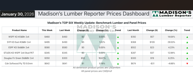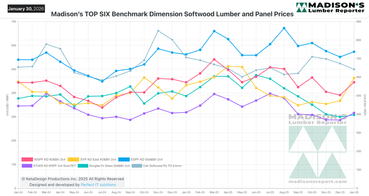 Madison’s Benchmark Top-Six Softwood Lumber and Panel Prices: 2024 -2026