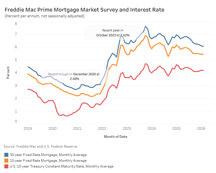 Mortgage rates continued to decline in February, dipping below 6% in the last week of February. According to Freddie Mac, the 30-year fixed-rate mortgage averaged 6.05% last month, 5 basis points (bps) lower than January. Meanwhile, the average 15-year rate declined only a basis point to 5.43%. Compared to a year ago, the 30-year and 15-year rates are lower by 79 bps and 60 bps, respectively.