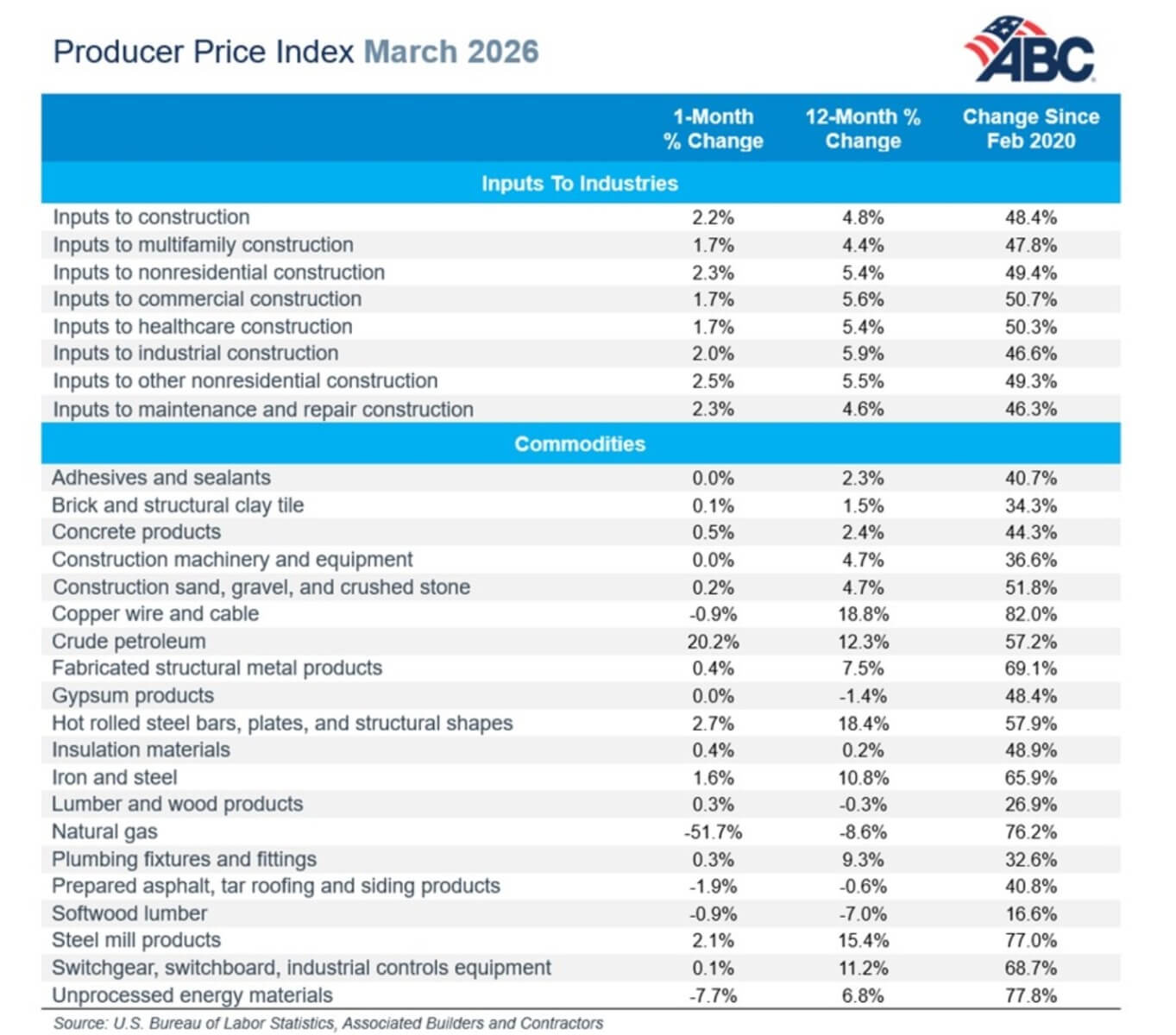 "The staggering jump in fuel costs only reflects prices as of mid-March,"said Ken Simonson, AGC chief economist. "Diesel fuel prices have continued to rise sharply since then, while the destruction of aluminum facilities and blockage of ship movements due to the Middle East war is driving costs still higher."
