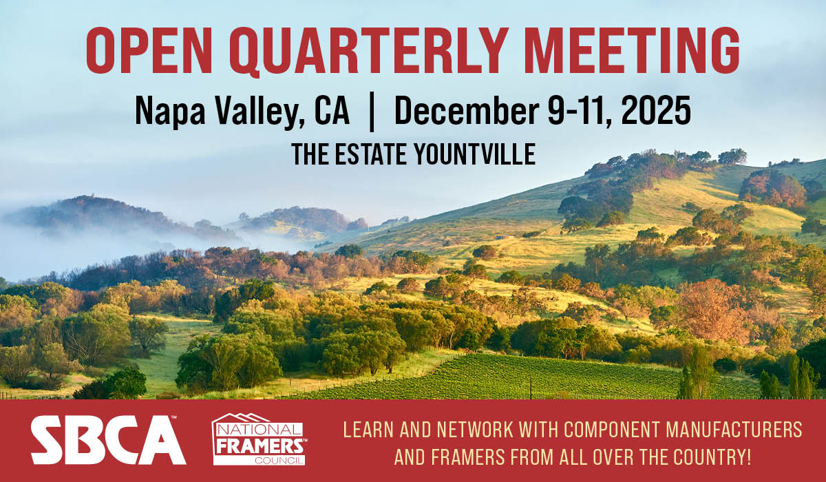 Registration is open and free for the Open Quarterly Meeting (OQM) in Napa Valley, CA, December 9–11, 2025. This event will bring component manufacturers, suppliers, framers, and industry leaders together for three days of updates, education, committee meetings, and networking, all set against the beautiful backdrop of wine country.