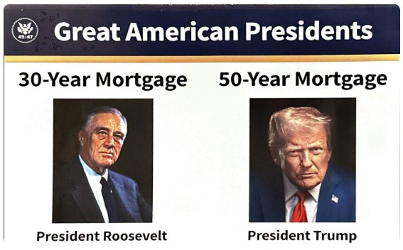 The image Trump posted on Truth Social features a head shot of President Franklin Delano Roosevelt under the title 30-year mortgage, and his own head shot under a title of 50-year mortgage. Pulte then replied: “Thanks to President Trump, we are indeed working on The 50 year Mortgage – a complete game changer.”