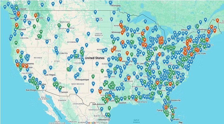 LBM facilities in the continental U.S. acquired (blue pins), that had or will have greenfield openings (green), or closed (red) YTD 2025. Source: Webb Analytics