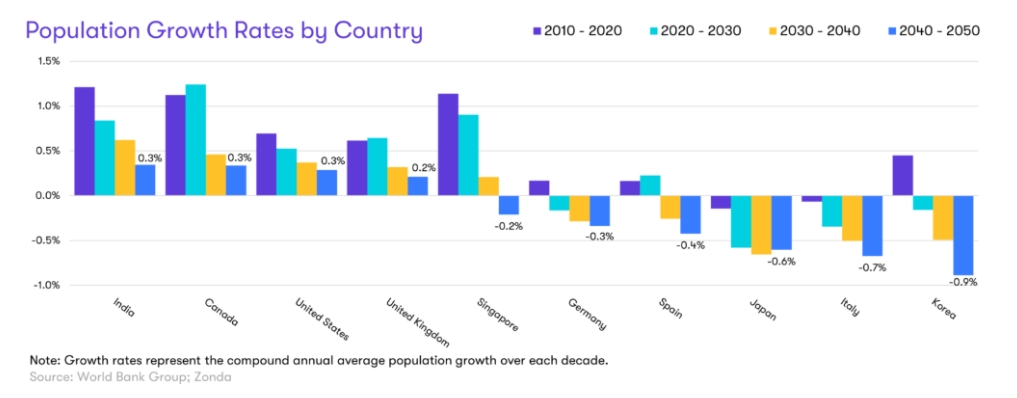 While U.S. growth is slowing, it remains positive, unlike many other large economies. Countries such as Germany, Japan, Italy, and South Korea are already experiencing population decline, creating structural headwinds for housing demand. Even traditionally high-growth markets like Canada and Singapore are seeing demographic momentum cool.