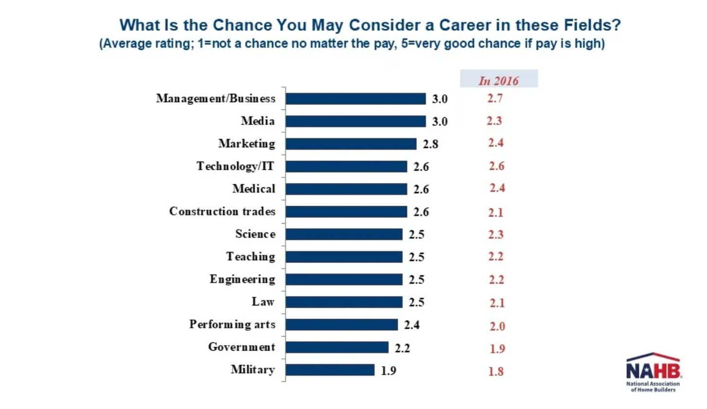 Young adults without a clear sense of career direction received a follow-up question about the chance they might consider a number of fields (construction trades being one of them) using a scale from 1 to 5, where 1 meant ‘no chance no matter the pay’ and 5 meant ‘very good chance if the pay is high.’ In 2026, construction trades received an average rating of 2.6, tying in fourth place on a list of 13 possible fields. A decade earlier, the trades received an average rating of 2.1 and ranked ninth on the same list.