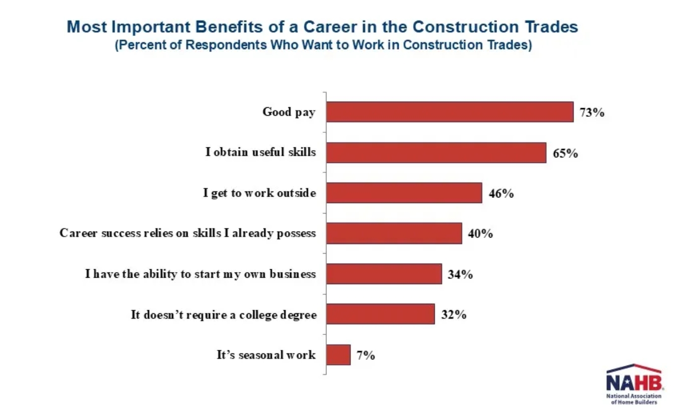 In a positive development for the home building industry, the share interested in a career in the construction trades doubled from 3% to 6% during this period. The two most important benefits they see in a career in the trades are good pay (73%) and the ability to obtain useful skills (65%).