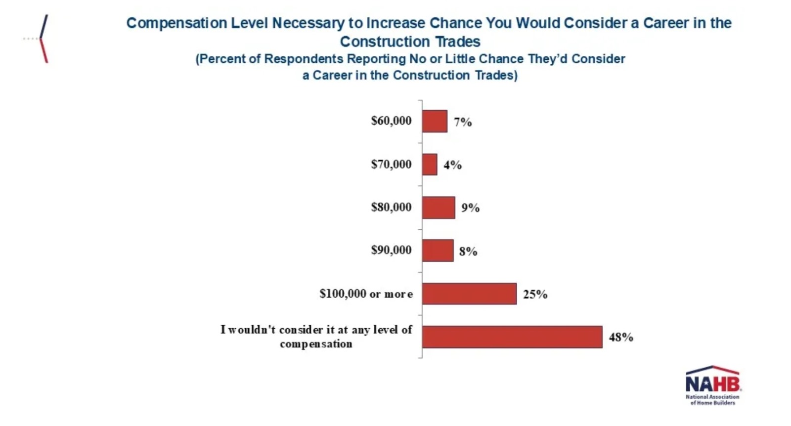 A final question asked the group most reluctant to consider a career in the trades if any compensation level might make them reconsider, and 48% once again affirmed they would not accept a career in the trades at any level of compensation. But, in a critical finding for the home building industry, most (52%) undecided young adults aged 18 to 25 who in theory would not choose a career in the trades would in fact reconsider that position for the right paycheck. That figure is at least $90,000 for 32% of this group and $60,000 to $80,000 for the other 20%. There are 12 construction occupations whose median annual wages already meet or exceed that threshold.