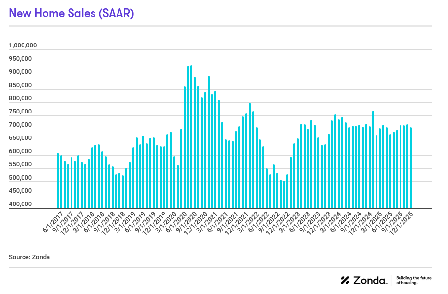 Zonda’s new home sales metric counts the number of new home contract sales each month and accounts for both cancellations and seasonality. This metric shows there were 705,682 new homes sold in December on a seasonally adjusted annualized rate. This was a decline of 1.5% from last month and a drop of 0.4% from a year ago. On a non-seasonally adjusted basis, 54,021 homes were sold, 0.4% higher than last year and 11.8% above the same month in 2019.