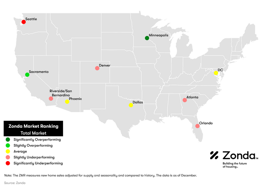 In order to add further context to sales, Zonda created the Zonda Market Ranking (ZMR). The ZMR accounts for both sales pace and volume, is seasonally adjusted, and is taken as a percentage relative to a baseline market average. Based on the percentage above or below baseline, markets are bucketed into performance groups ranging from significantly underperforming to significantly overperforming relative to historical activity.
