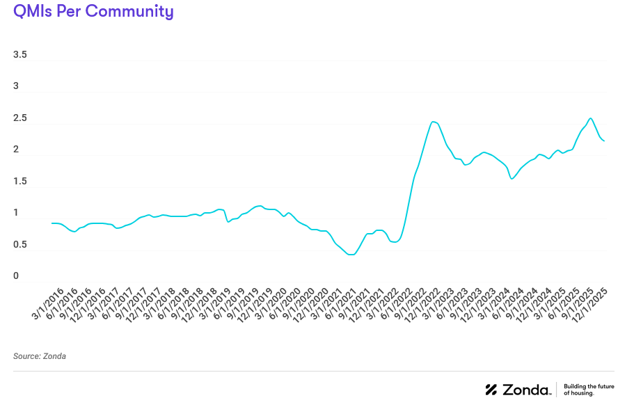 QMIs per community is a good way to track how new home supply looks in the context of actively selling projects. There were 2.2 QMIs per community nationally in December, up 14.9% from the 1.9 recorded this time last year but have trended down for three consecutive months.