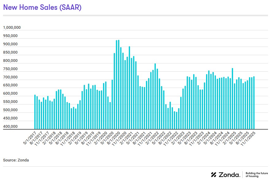 Zonda’s new home sales metric counts the number of new home contract sales each month and accounts for both cancellations and seasonality. This metric shows there were 719,581 new homes sold in November on a seasonally adjusted annualized rate. This was a gain of 0.9% from last month and an increase of 0.2% from a year ago. On a non-seasonally adjusted basis, 53,999 homes were sold, 1.3% higher than last year and 12.6% above the same month in 2019.