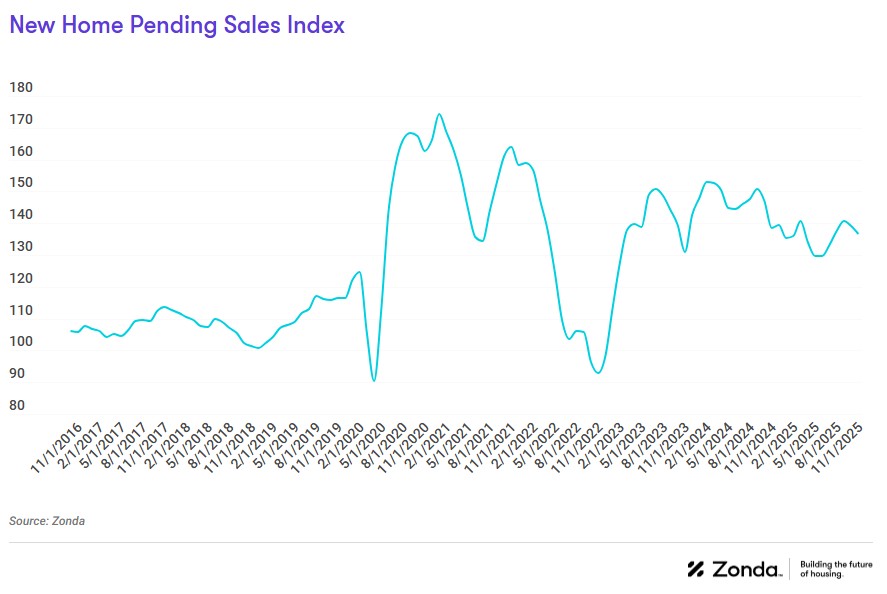 Zonda’s New Home Pending Sales Index (PSI) was created to help account for fluctuations in supply by combining both total sales volume with the average sales rate per month per community. The November PSI came in at 136.6, representing a 1.4% decline from the same month last year. The index is currently 21.6% below cycle highs. On a month-over-month basis, seasonally adjusted new home sales decreased 1.8%.