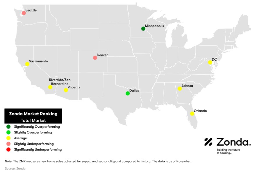 In order to add further context to sales, Zonda created the Zonda Market Ranking (ZMR). The ZMR accounts for both sales pace and volume, is seasonally adjusted, and is taken as a percentage relative to a baseline market average. Based on the percentage above or below baseline, markets are bucketed into performance groups ranging from significantly underperforming to significantly overperforming relative to historical activity.