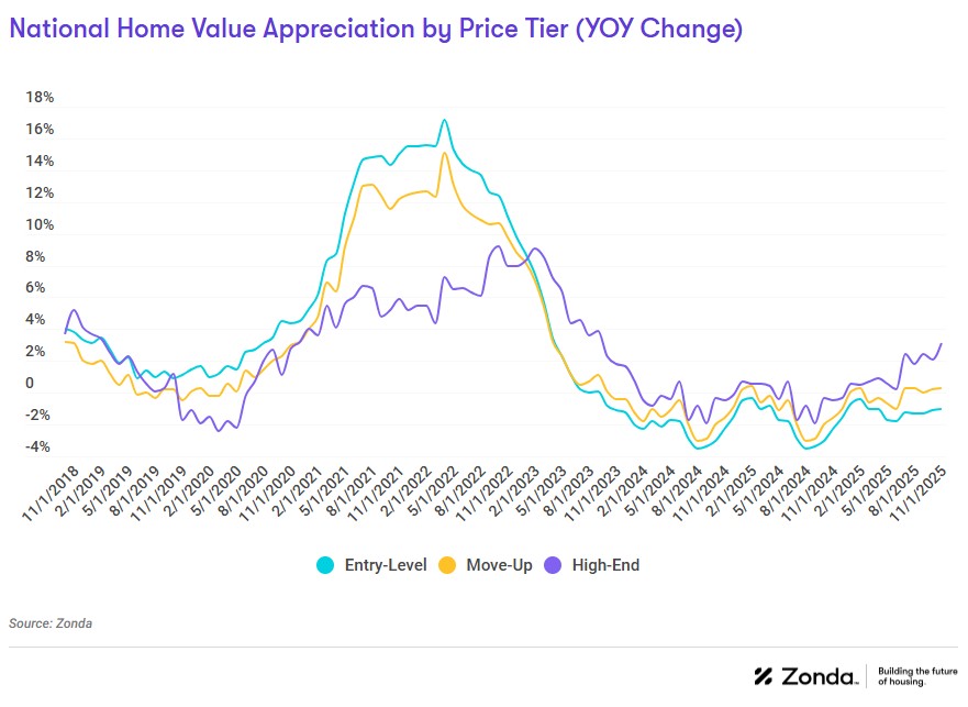 National home prices fell 1.0% for entry-level to $323,849, held flat for move-up at $517,079, and rose 3.1% for high-end homes to $931,921. The rise in high-end home prices reflects new communities opening at higher price points, improvements in design quality, larger lots and home sizes, and/or better locations.
