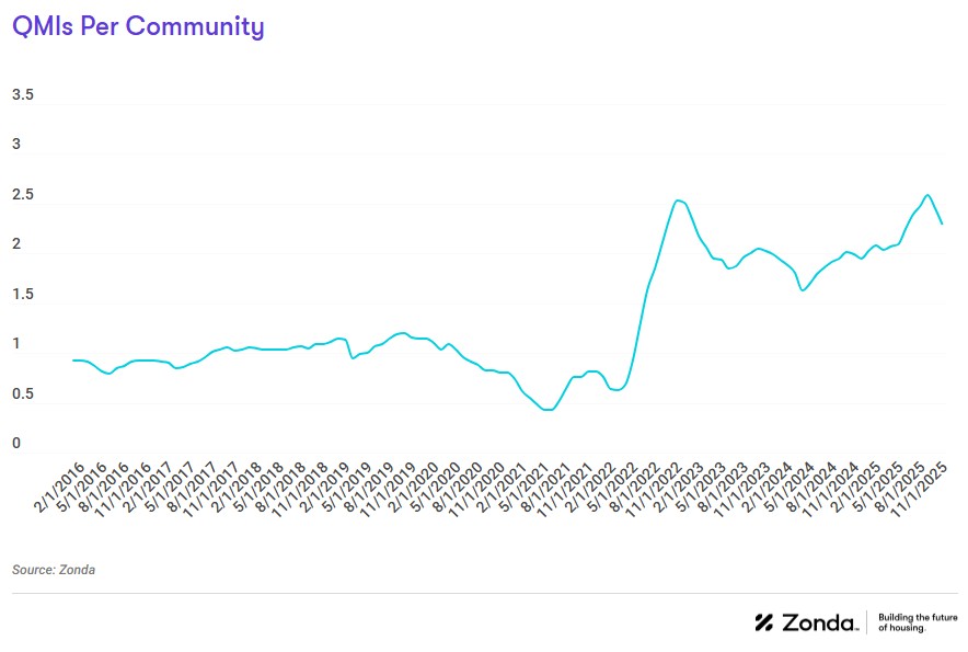 QMIs per community is a good way to track how new home supply looks in the context of actively selling projects. There were 2.3 QMIs per community nationally in November, up 14.9% from the 2.0 recorded this time last year but have trended down for two consecutive months.