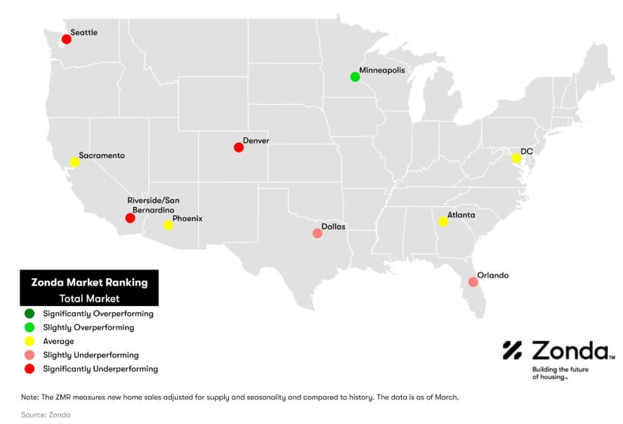 - Zonda’s snapshot markets were split between 10% overperforming, 40% average, and 50% underperforming, reflecting a slight decline from last month. Among Zonda’s top 50 major markets, 28% were overperforming, 34% were average, and 38% were underperforming.