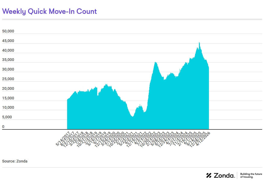 National quick move-ins (QMIs) totaled 32,332, down 4.3% compared to last year and 7.1% lower month-over-month. Total QMIs are 71.3% above 2019 levels. QMIs are homes that can likely be occupied within 90 days.