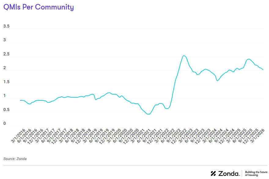 QMIs per community is a good way to track how new home supply looks in the context of actively selling projects. There were 2.0 QMIs per community nationally in March, up 4.3% from the 1.9 recorded this time last year but have trended down for six consecutive months.