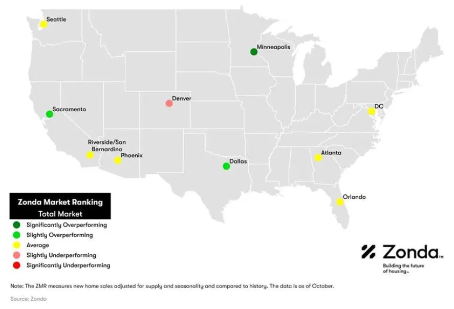 In order to add further context to sales, Zonda created the Zonda Market Ranking (ZMR). The ZMR accounts for both sales pace and volume, is seasonally adjusted, and is taken as a percentage relative to a baseline market average. Based on the percentage above or below baseline, markets are bucketed into performance groups ranging from significantly underperforming to significantly overperforming relative to historical activity.