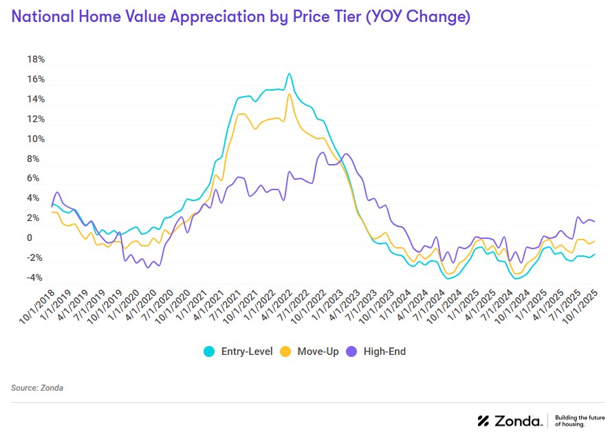 National home prices increased year-over-year for move-up and high-end homes. Prices fell 1.0% for entry-level to $324,583 but rose 0.3% for move-up to $518,406 and 2.2% for high-end homes to $932,501. The rise in high-end home prices reflects new communities opening at higher price points, improvements in design quality, larger lots and home sizes, and/or better locations.