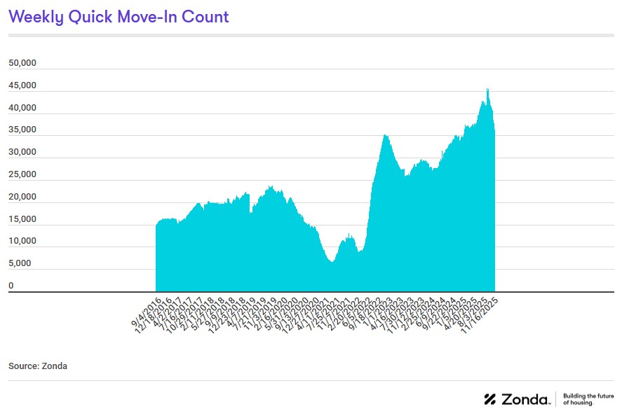 National quick move-ins (QMIs) totaled 36,287, up 8.5% compared to last year but 12.5% lower month-over-month. Total QMIs are 65.5% above 2019 levels. QMIs are homes that can likely be occupied within 90 days.