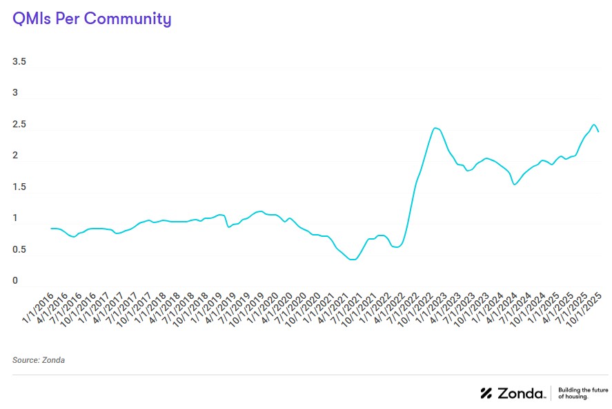 QMIs per community is a good way to track how new home supply looks in the context of actively selling projects. There were 2.5 QMIs per community nationally in October, up 25% from the 2.0 recorded this time last year.